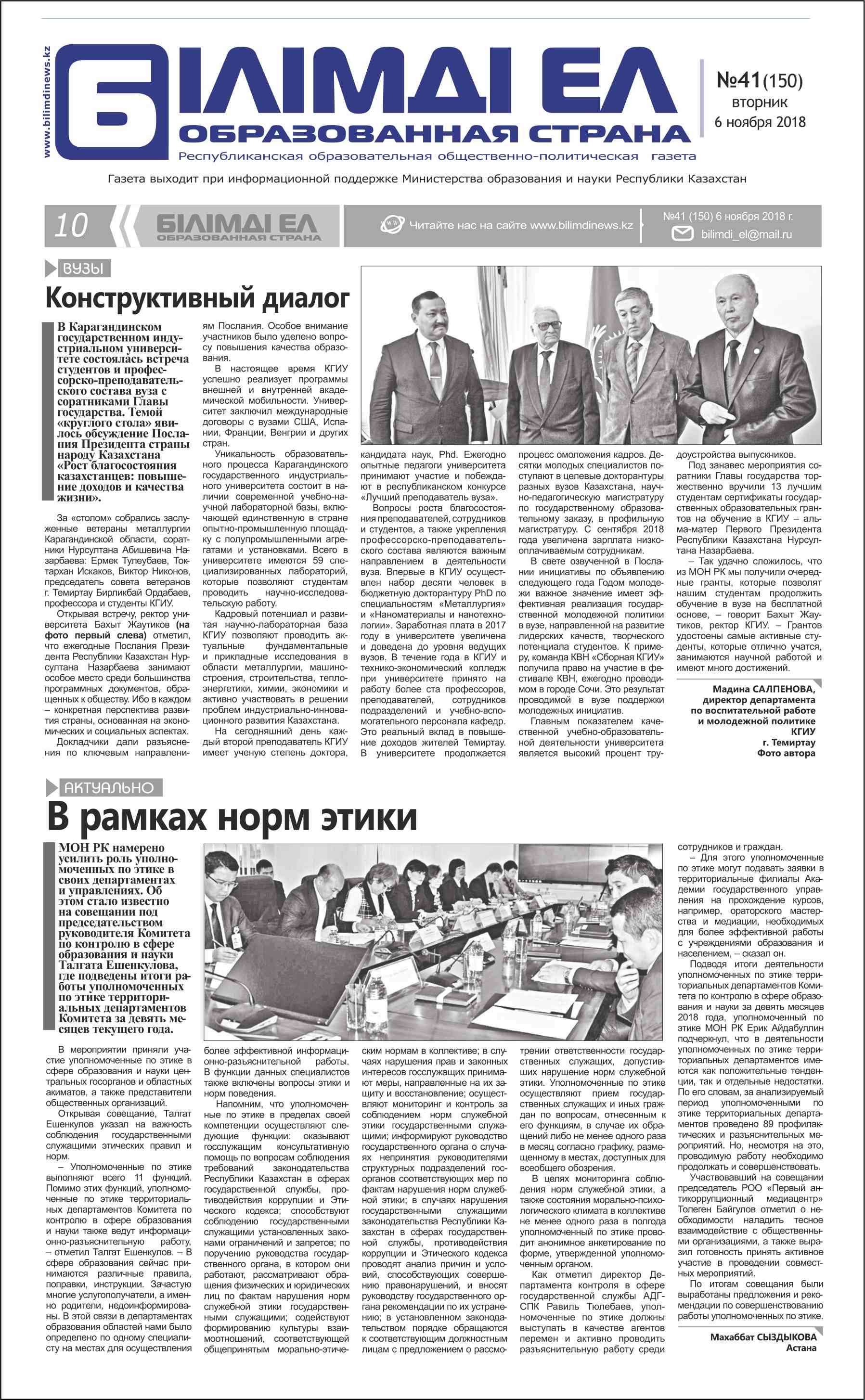 publication|ПУБЛИКАЦИЯ В ГАЗЕТЕ Образованная страна № 41 от 6 ноября 2018 «Конструктивный диалог»| 2018 ЖЫЛЫ 6 ҚАРАША КҮНІ «БІЛІМДІ ЕЛ» ГАЗЕТІНІҢ №41 САНЫНДА ЖАРИЯЛАНҒАН “КОНСТРУКТИВНЫЙ ДИАЛОГ” АТТЫ МАҚАЛА