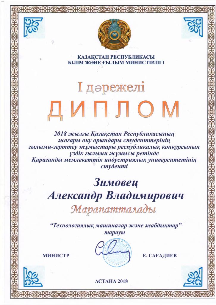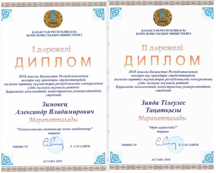 Зимовец Александр Владимирович студенты группы ТМиО-14 был награжден дипломом 1 степени за лучшую научно – исследовательскую работу «Анализ условий работы и моделирование напряженно-деформированного состояния (НДС) подушек прокатных валков», работа была выполнена под руководством к.т.н., доцента Ногаева Кайроша Абиловича, а Зияда Тілеулес Таңатқызы, студентка группы БЖД-16к получила диплом второй степени за научно – исследовательскую работу «Өрттің шығу себептеріне тәуелді өртқауіпсіздігі шараларын бағалау» работа была выполнена под руководством д.м.н., профессор Аманжол Изтилеу Аманжоловича.