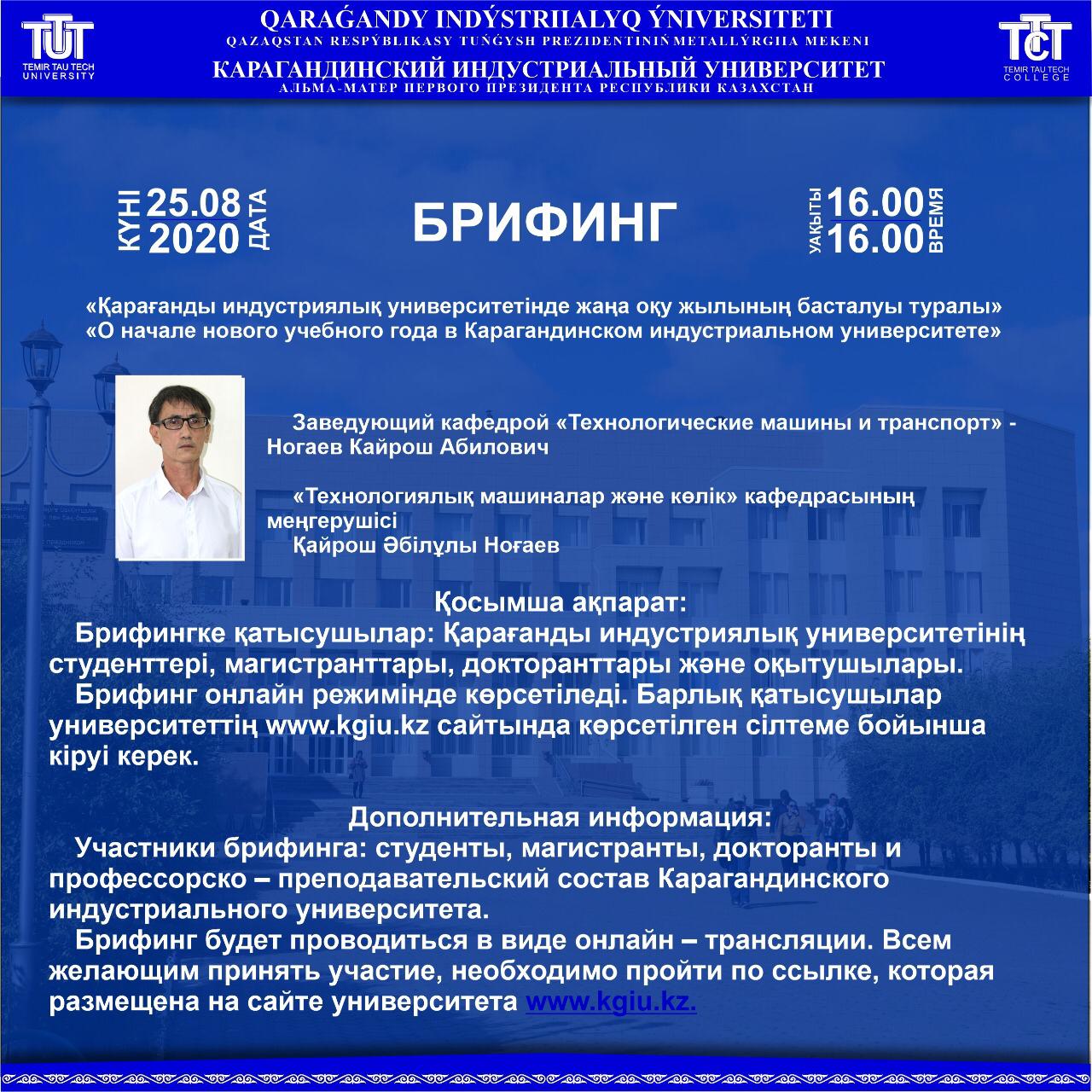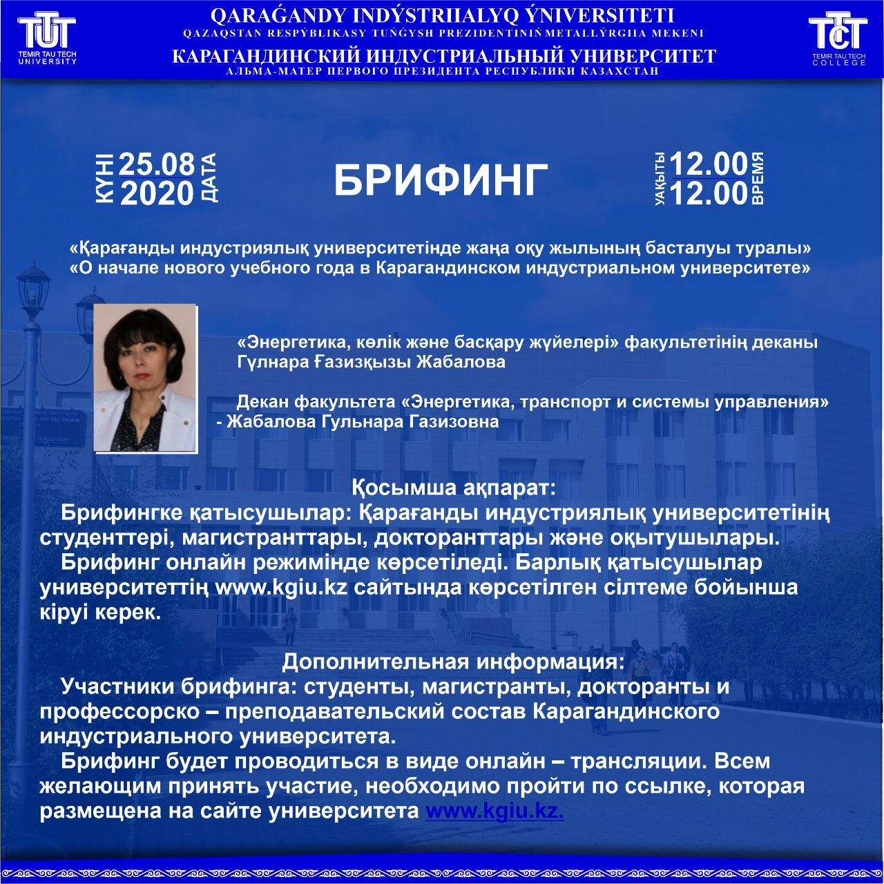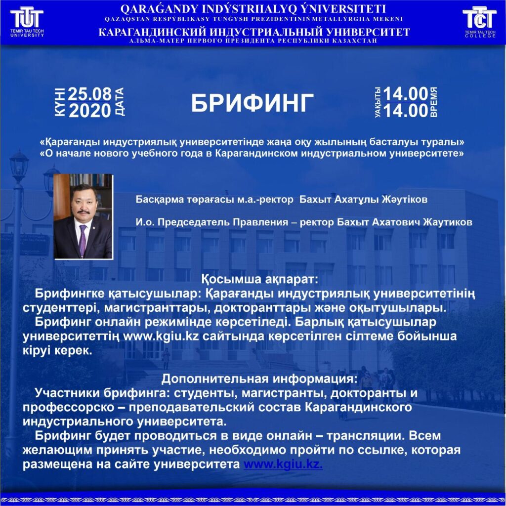 Уважаемые студенты, магистранты и докторанты Карагандинского индустриального университета. Приглашаем Вас принять активное участие 25 августа 2020 года в брифинге по разъяснению вопросов «Организационное начало нового учебного года».