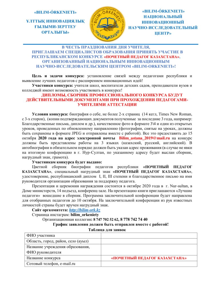 TO CELEBRATE TEACHER’S DAY, WE INVITE EDUCATION SPECIALISTS TAKE PART IN THE REPUBLICAN CONTEST «HONORARY TEACHER OF KAZAKHSTAN», ORGANIZED BY THE NATIONAL INNOVATION RESEARCH CENTER «BILIM-ORKENIETI»!