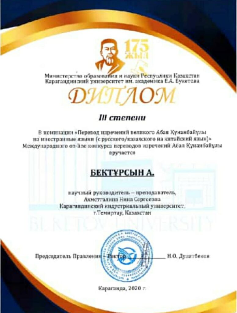 In October 2020 by the Department of «theory and practice of translation» of the faculty of «Foreign languages» of Karaganda state University. academician E. A. Buketov held an international on — line competition for translations of the sayings of the great Abai Kunanbayuly into foreign languages (English, French, German, Chinese), which was attended by a student of the TFP-20k group of the faculty of Metallurgy and mechanical engineering Bektursun Aidanbek.
