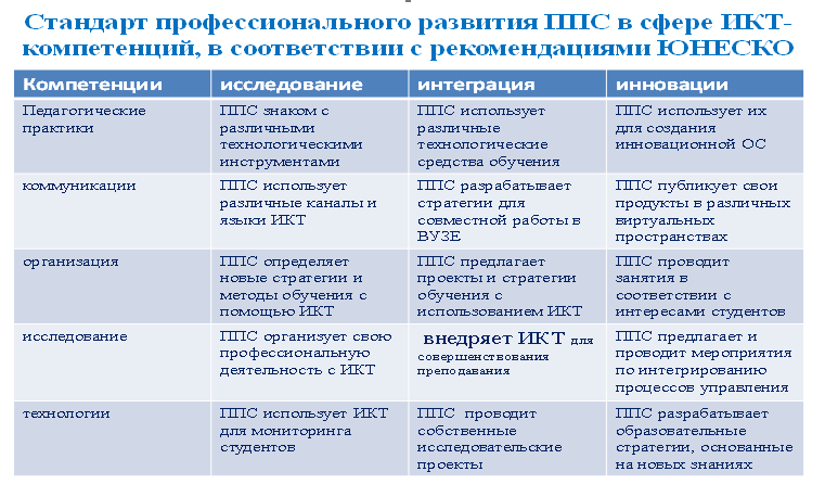 - Внедрение стандарта профессионального развития ППС в сфере ИКТ – компетенций, в соответствии с рекомендациями ЮНЕСКО в Карагандинском индустриальном университете, который позволит выдвинуться ВУЗу на международные позиции, зная их идею. Результатом реализации стандарта профессионального развития является разработка образовательных стратегий, основанные на новых информационных знаниях.
