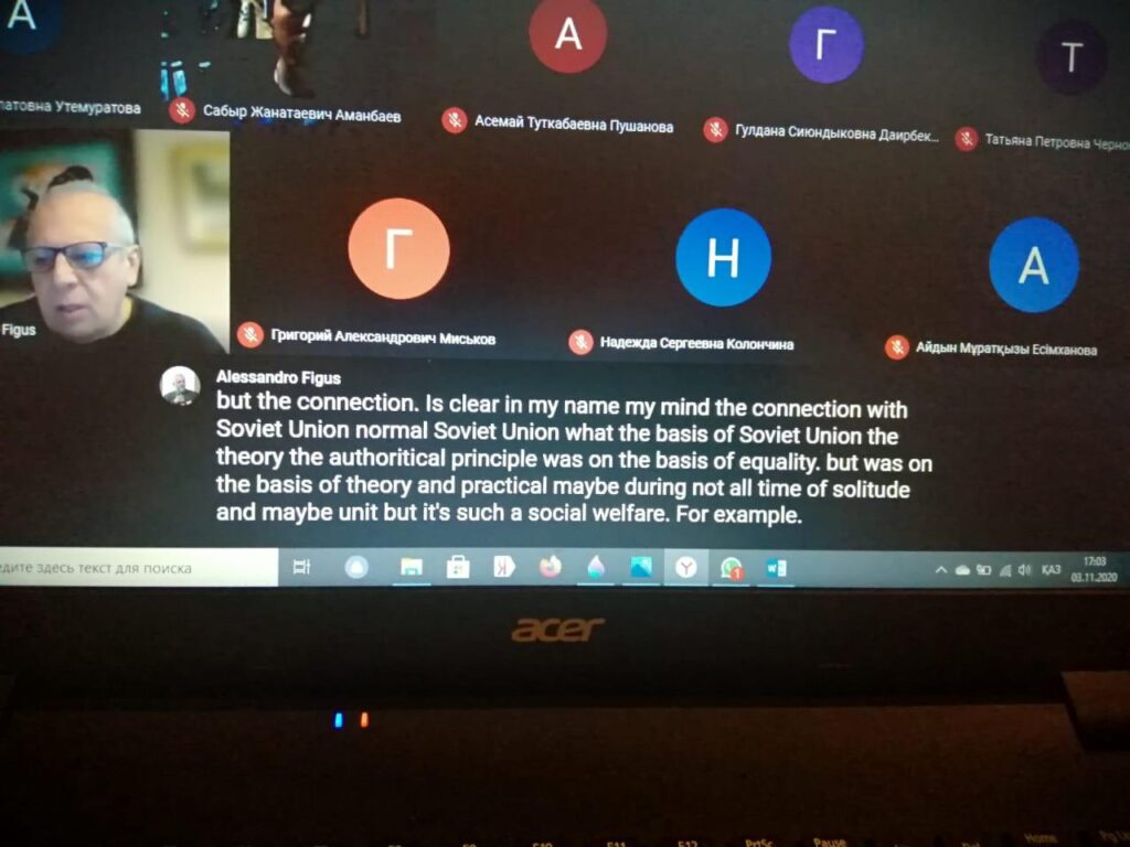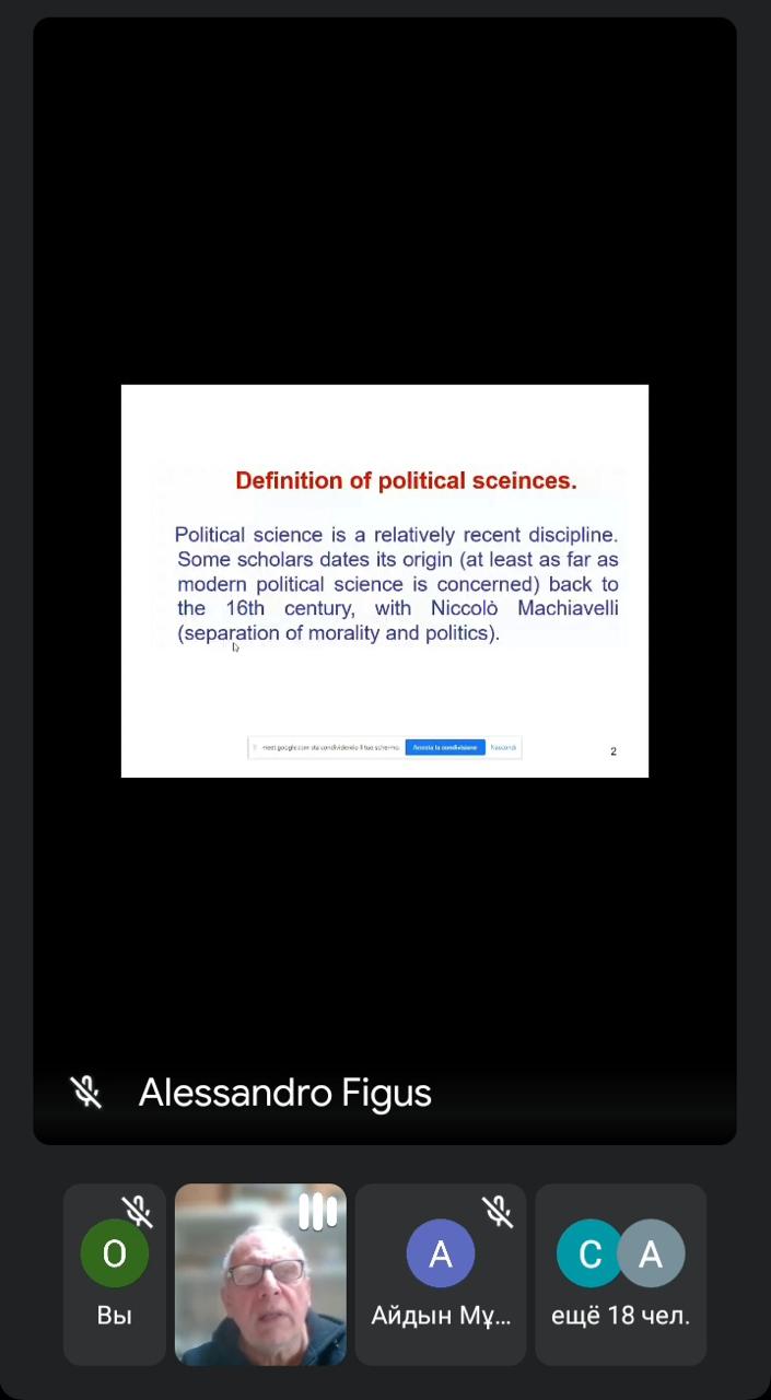 [/kk] [en]Every year, within the framework of international cooperation, professors of leading foreign universities conduct lectures for students of our University. The quarantine period has made its own adjustments and this year such lectures are held in an online format. Currently, the course of lectures on the discipline «Political Science and International relations» is taught by Professor of the research center for intelligence and strategic studies at Link Campus University (Italy) Alessandro Figus.