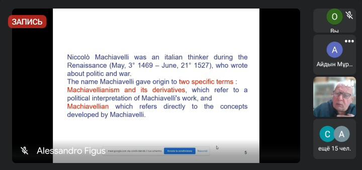 [/ru] [kk]Халықаралық ынтымақтастық шеңберінде жыл сайын шетелдік жетекші жоғары оқу орындарының профессорлары біздің университет студенттеріне дәрістер оқиды. Карантин кезеңі өз түзетулерін енгізді және биыл ондай дәрістер онлайн режимінде өткізілуде. Қазіргі уақытта «Саясаттану және халықаралық қатынастар» пәні бойынша дәрістер курсын Линк Кампус Университеті (Италия) Зияткерлік және стратегиялық зерттеулер ғылыми-зерттеу орталығының профессоры Алессандро Фигус оқиды.