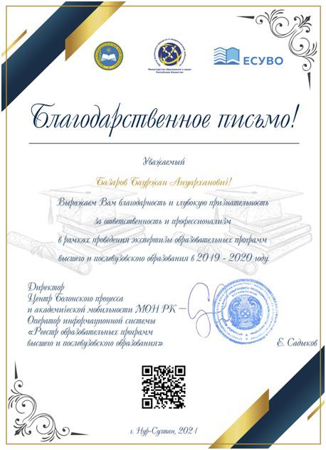 More than 50 educational programs were submitted for examination. As a result of the work done, a letter of thanks for the responsibility and professionalism within the framework of the examination of educational programs of higher and postgraduate education was received by the head of the Department of Construction, Doctor of Technical Sciences, Professor Bazarov Baurzhan Anuarkhanovich.