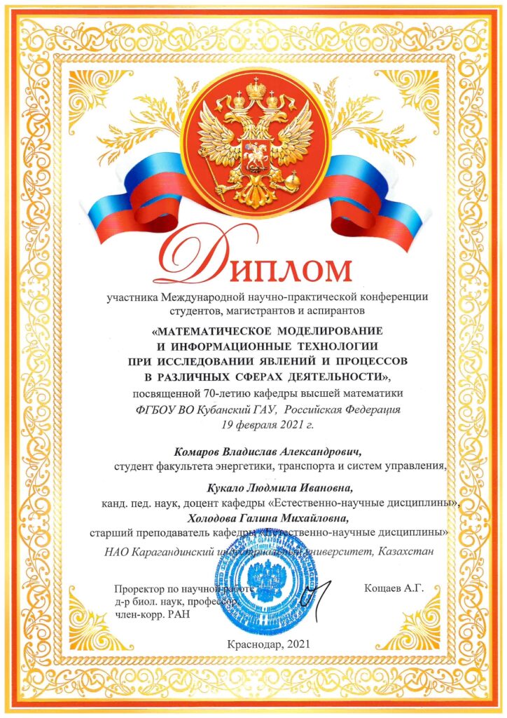 [/en] [kk]ПИ-19 тобының студенті Комаров Владислав Александрович Кубан мемлекеттік аграрлық университетінің ( Краснодар қ., Ресей Федерациясы) ФМБОУ Жоғары математика кафедрасының 70 жылдығына арналған «Әртүрлі қызмет салаларындағы құбылыстар мен процестерді зерттеудегі математикалық модельдеу және ақпараттық технологиялар» атты Халықаралық ғылыми-практикалық конференцияға қатысты.
