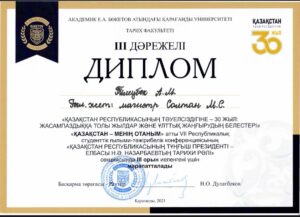 Araylym won a prize among 450 students. The jury members of the Republican Conference noted the high potential of our student. Araylym’s supervisor is Magira Soltanovna Soltan, Master of Historical Sciences. Despite her young age, Arailym is actively engaged in research activities, she is also actively involved in the public life of the university and the city. Araylym heads the student parliament of our university. We sincerely congratulate Arailym on his victory and wish him new successes!
