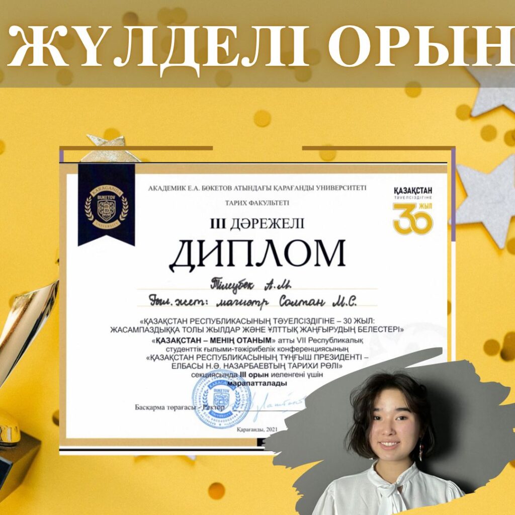 Araylym won a prize among 450 students. The jury members of the Republican Conference noted the high potential of our student. Araylym’s supervisor is Magira Soltanovna Soltan, Master of Historical Sciences. Despite her young age, Arailym is actively engaged in research activities, she is also actively involved in the public life of the university and the city. Araylym heads the student parliament of our university. We sincerely congratulate Arailym on his victory and wish him new successes!
