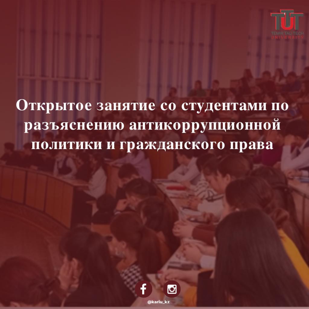 Спикерами открытого занятия являлись активисты студенческого клуба «Саналы ұрпак» студенты гр. МиТНМ-19к Ибраева Амина, Ибраева Адина, студент группы МиТНМ-20к Табашев Алихан, студент гр. ОМД-20к Мамаев Бакдаулет под руководством Солтан М.СЦелью мероприятия являлось формирование у студентов антикоррупционной культуры, воспитание справедливости, знаний о законах против коррупции. Велось обсуждение по борьбе с коррупцией в нашей и других странах, возможности ее искоренения. Студенты задавали спикерам интересующие вопросы, бурно обсуждали, предлагая различные методы борьбы с коррупцией.