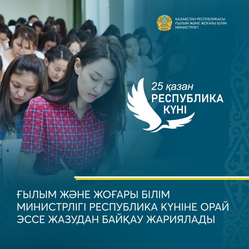 МИНИСТЕРСТВО НАУКИ И ВЫСШЕГО ОБРАЗОВАНИЯ РК ЗАПУСТИЛО КОНКУРС ЭССЕ В ЧЕСТЬ ДНЯ РЕСПУБЛИКИ!|MINISTRY OF SCIENCE AND HIGHER EDUCATION OF THE REPUBLIC OF KAZAKHSTAN LAUNCHED AN ESSAY CONTEST IN HONOR OF THE REPUBLIC DAY!|ҒЫЛЫМ ЖӘНЕ ЖОҒАРЫ БІЛІМ МИНИСТРЛІГІ РЕСПУБЛИКА КҮНІНЕ ОРАЙ ЭССЕ ЖАЗУДАН БАЙҚАУ ЖАРИЯЛАДЫ!